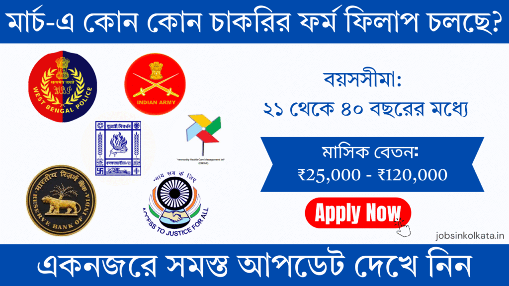 মার্চ ২০২৬ মাসে পশ্চিমবঙ্গ ও কেন্দ্রীয় সরকারের গুরুত্বপূর্ণ চাকরির বিজ্ঞপ্তিগুলো দেখে নিন। মাধ্যমিক পাশ থেকে গ্র্যাজুয়েশন—অগ্নিবীর, RBI, স্বাস্থ্য বিভাগ ও কলেজে নিয়োগের শেষ তারিখ ও আবেদনের লিঙ্ক এখানে দেওয়া হলো।