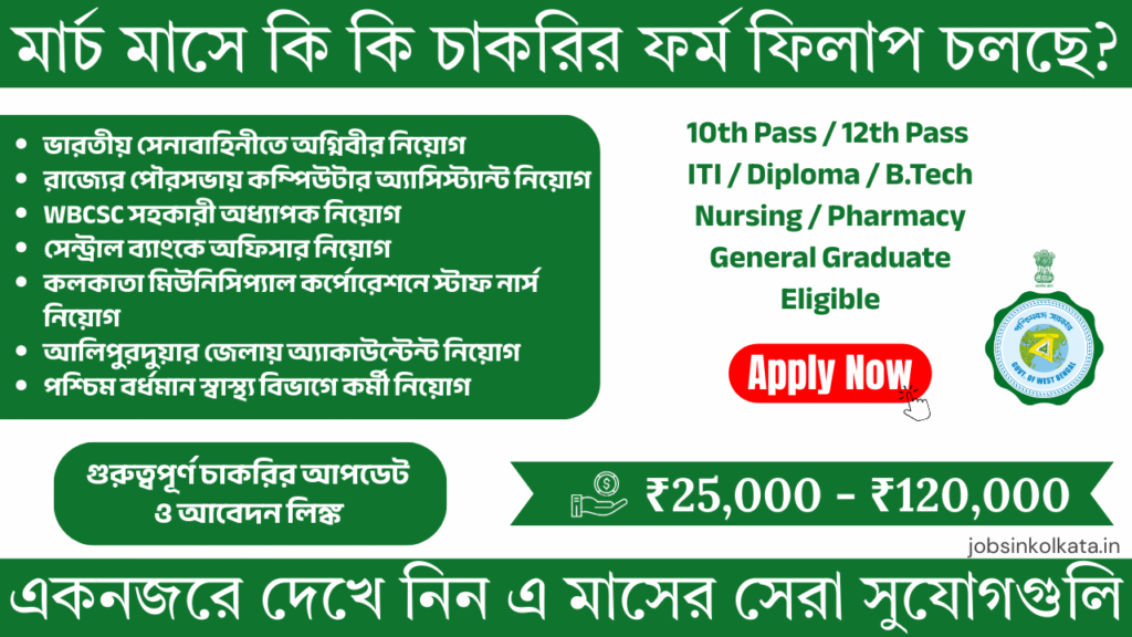 পশ্চিমবঙ্গের চাকরিপ্রার্থীদের জন্য ২০২৬ সালের মার্চ মাসটি অত্যন্ত গুরুত্বপূর্ণ। এই মাসে কেন্দ্র ও রাজ্য সরকারের একাধিক দপ্তরে হাজার হাজার শূন্যপদে নিয়োগের জন্য ফর্ম ফিলাপ চলছে। অষ্টম পাশ থেকে শুরু করে গ্র্যাজুয়েশন—সব ধরনের যোগ্যতার প্রার্থীরাই আবেদন করার সুযোগ পাচ্ছেন। আপনি যদি এখনো আবেদন না করে থাকেন, তবে দেরি না করে আজকের প্রতিবেদনটি পড়ে দ্রুত আবেদন সেরে ফেলুন।