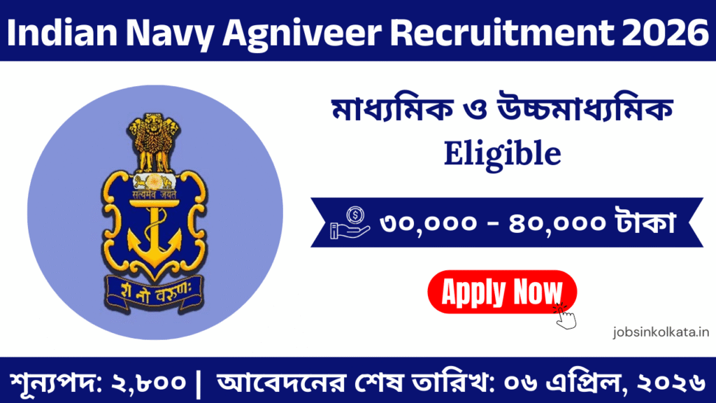 ভারতীয় নৌবাহিনী ২০২৬ সালের জন্য অগ্নিবীর (SSR, MR এবং Medical Branch) পদে নিয়োগের বিজ্ঞপ্তি প্রকাশ করেছে। পশ্চিমবঙ্গসহ সারা ভারতের অবিবাহিত নারী ও পুরুষ প্রার্থীরা এই পদের জন্য আবেদন করতে পারবেন। ৩,৪০০টি শূন্যপদে এই বিশাল নিয়োগ প্রক্রিয়ায় মাসিক বেতন শুরু হবে ৩০,০০০ টাকা থেকে।