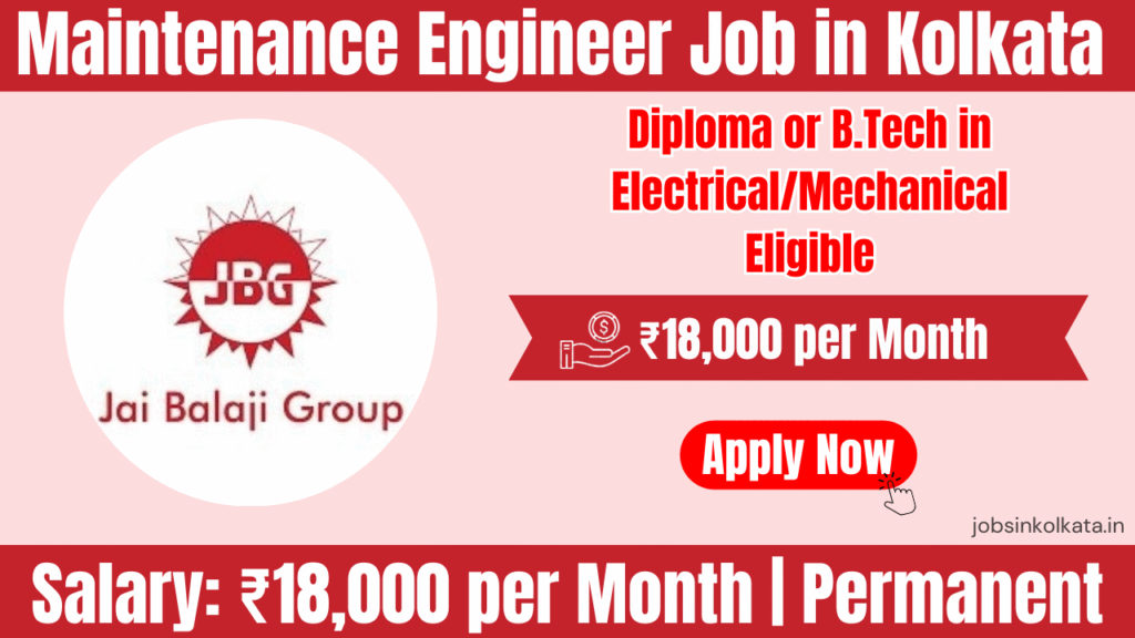 Jai Balaji Group is hiring Maintenance Engineers in Kolkata. Diploma and B.Tech candidates in Electrical or Mechanical engineering can apply. Freshers as well as candidates with 1–3 years of experience are encouraged to apply.