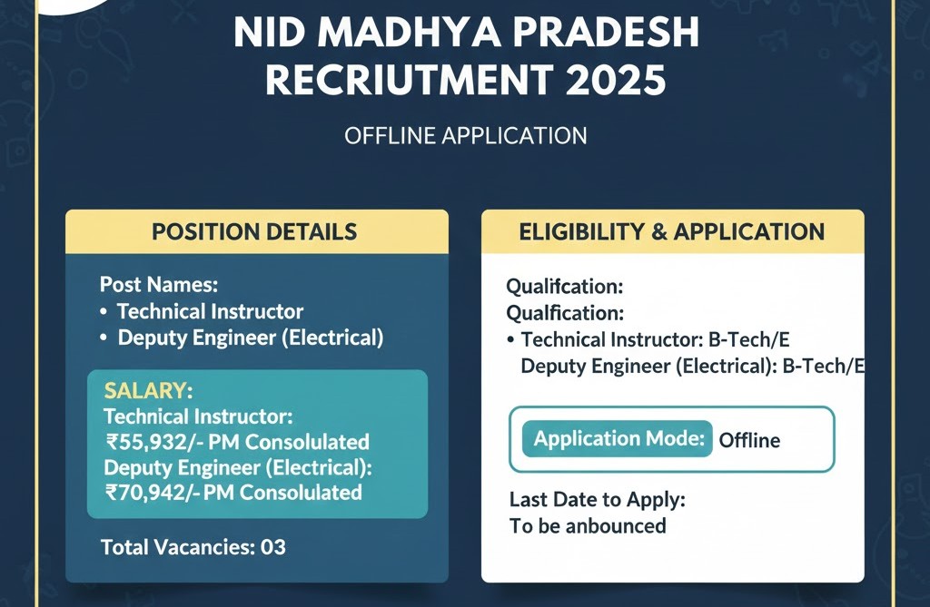 National Institute of Design, Madhya Pradesh (NIDMP) has released an official notification for 03 Technical Instructor & Deputy Engineer (Electrical) Posts. Eligible candidates can apply online before 04 December 2025.