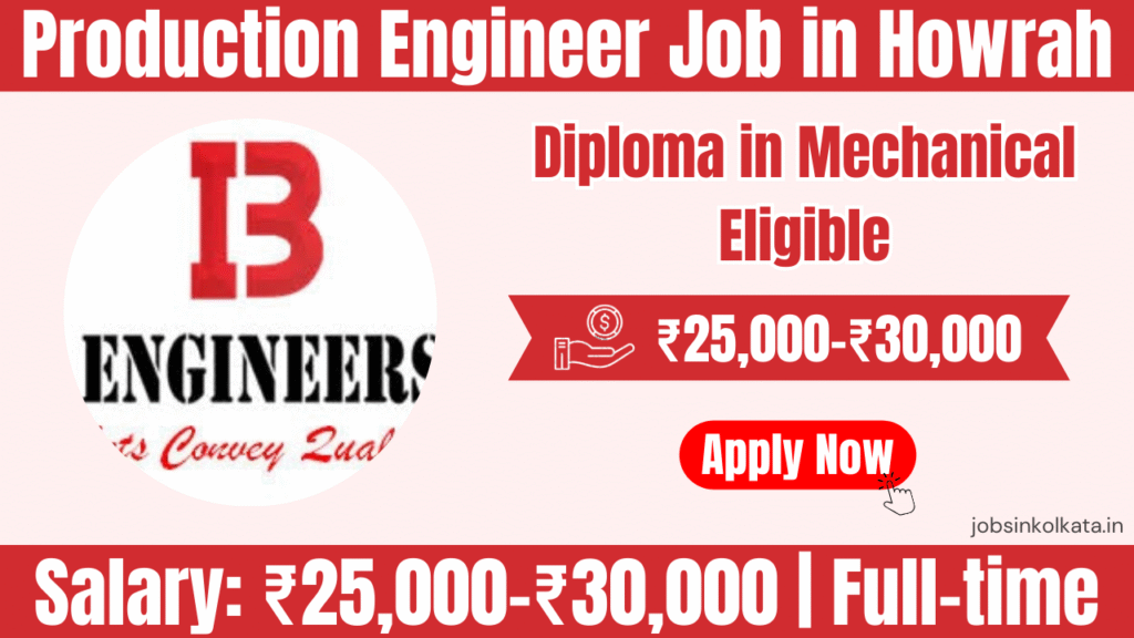 Apply for Production Supervisor / Production Engineer job at I&B Engineers Pvt Ltd in Howrah, West Bengal. Salary ₹25,000–₹30,000 per month. Diploma in Mechanical Engineering with 5–8 years fabrication and machining experience required. Fooding & accommodation provided. Apply now.