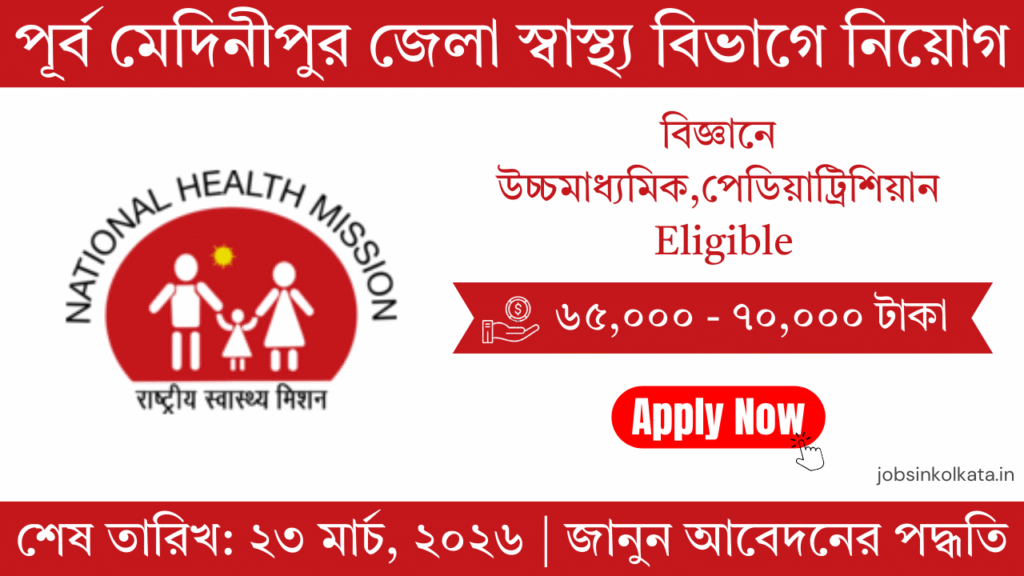 পশ্চিমবঙ্গ স্বাস্থ্য ও পরিবার কল্যাণ দপ্তরের তরফে এক নতুন নিয়োগের বিজ্ঞপ্তি প্রকাশ করা হয়েছে। ন্যাশনাল হেলথ মিশন (NHM) এবং ‘চোখের আলো’ প্রকল্পের আওতায় পূর্ব মেদিনীপুর জেলার স্বাস্থ্য বিভাগে বিভিন্ন পদে কর্মী নিয়োগ করা হবে। নারী ও পুরুষ উভয় প্রার্থীই এই পদের জন্য আবেদন করতে পারবেন।