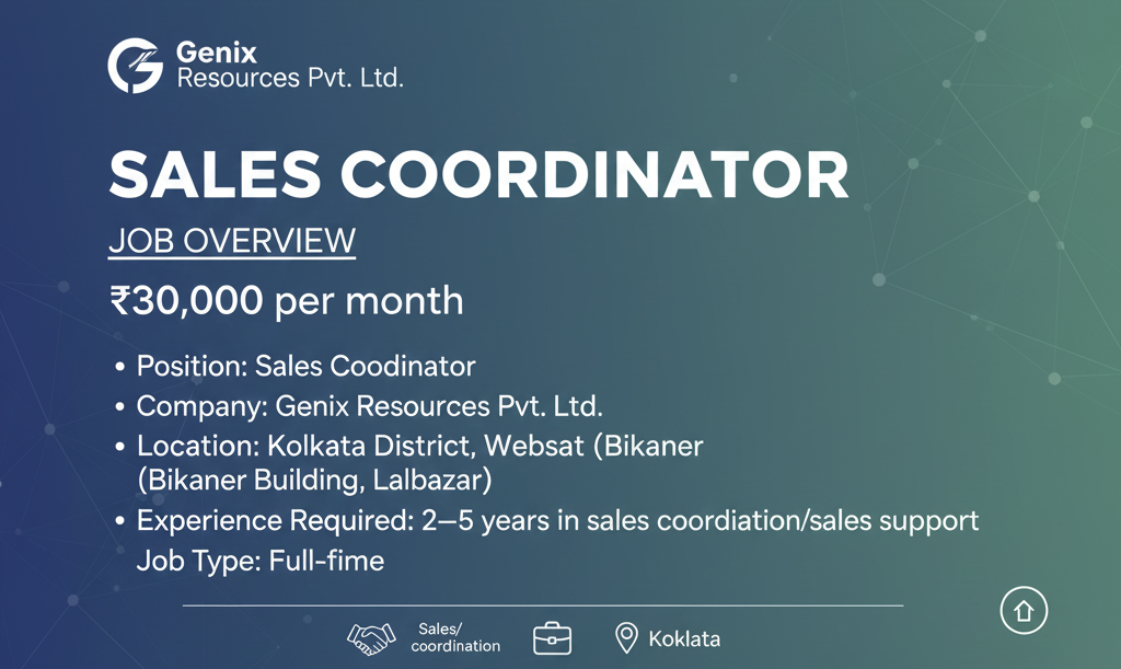 Genix Resources Pvt. Ltd is inviting applications for the position of Sales Coordinator. This role involves sales support, documentation, reporting, and coordination across departments.